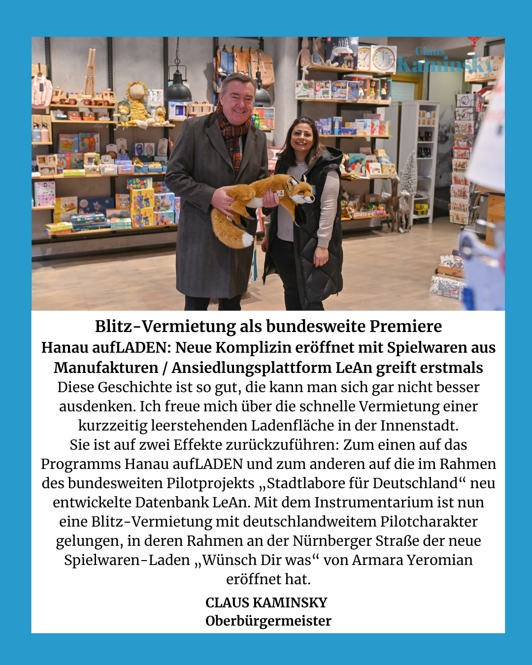 Das Programm des Bundesministeriums des Innern, für Bau und Heimat (BMI) fördert bundesweit Projektvorschläge für innovative Konzepte und Handlungsstrategien, die eine Innenstadt resilienter gegen Krisen machen und dazu beitragen soll, den anhaltenden Strukturwandel vor allem im Einzelhandel aufzuhalten. Die Brüder-Grimm-Stadt hat unter Federführung der Hanau Marketing GmbH dafür bereits 2019 das Programm „Hanau aufLADEN“ gestartet. Das für Hanau avisierte Fördervolumen sei „außergewöhnlich hoch“, stellt Kaminsky fest. Maximal fünf Millionen Euro konnten an Zuschüssen beantragt werden, nur eine Handvoll der insgesamt 238 geförderten Kommunen bekomme mehr Fördergeld als Hanau. „Wir spielen dabei in einer Liga mit Hamburg, Leipzig oder Frankfurt“, freut sich Kaminsky.