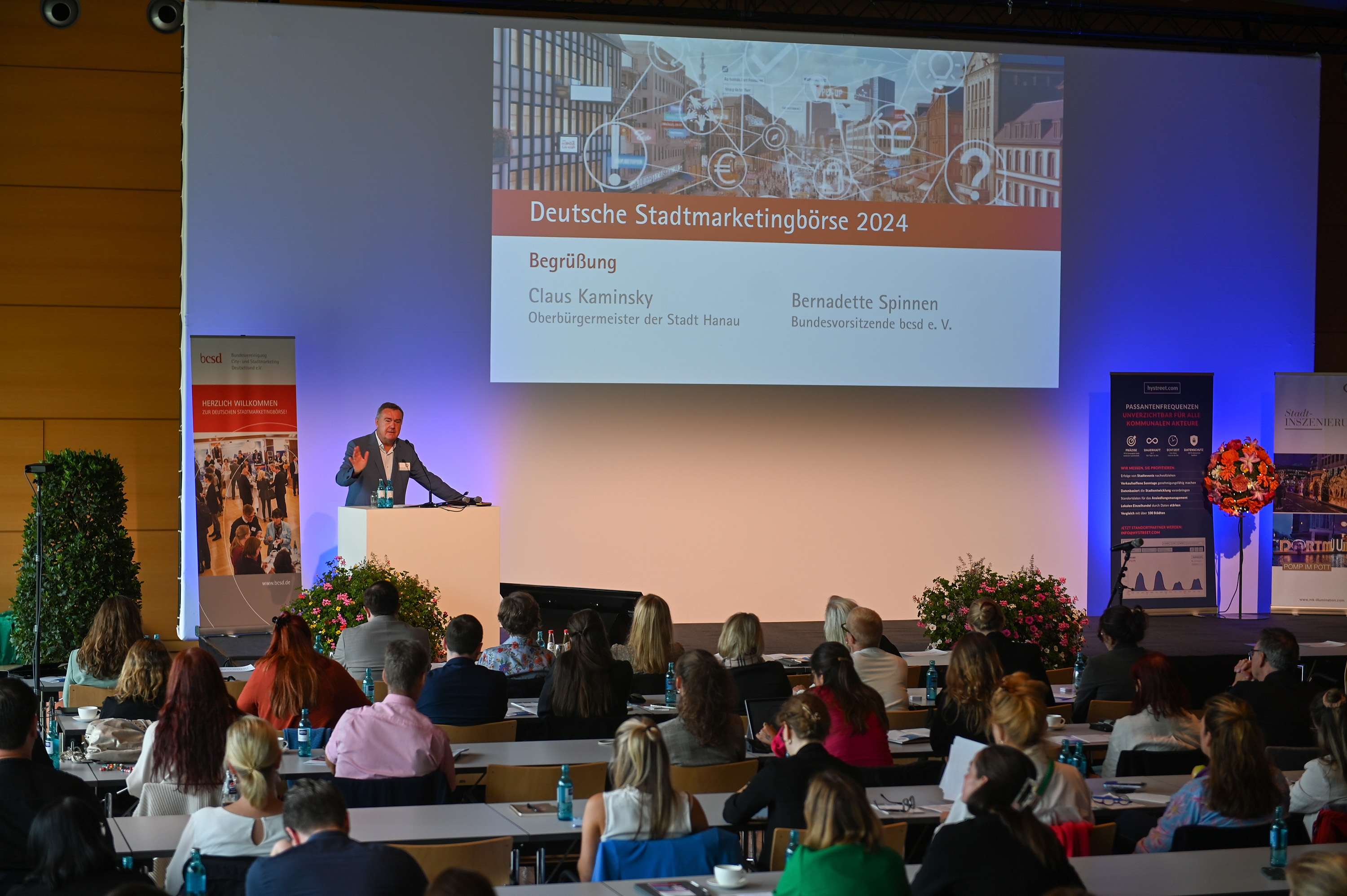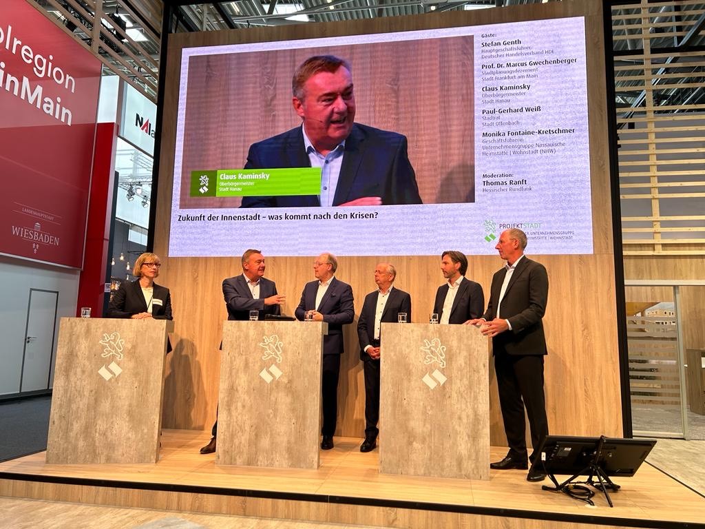 Auf einem Podium der Unternehmensgruppe Nassauische Heimstätte diskutierte Oberbürgermeister Claus Kaminsky unter anderem mit Klara Geywitz (Bundesministerin für Wohnen, Stadtentwicklung und Bauwesen) zum Thema „Zukunftsfähige Innenstadt – neue Ideen für die urbanen Zentren“. Kaminsky stellte klar, dass multifunktionale Ansätze, weg von der reinen Handelsimmobilie, bei der Nachnutzung den größten Erfolg versprechen. „Monofunktionale Innenstädte haben ausgedient. Daher vereinen wir unterschiedlichste Themenfelder wie Bildung, Erlebnis, Kultur und eben auch ein besonderes Einkaufserlebnis im neuen Stadthof. Es entsteht ein Treffpunkt im Herzen der Stadt, wir schaffen ein neues Quartier.“