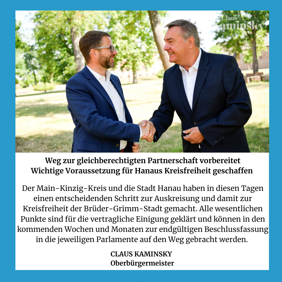 Schließlich werde die von Hanau angestrebte Kreisfreiheit auch Vorteile für den Main-Kinzig-Kreis bringen. „Eine schärfere Profilierung des Kreises einerseits und die klare Positionierung einer kreisfreien Stadt Hanau auf der anderen Seite werden dazu führen, dass künftig zwei starke Stimmen im Osten der Rhein-Main-Region für die Interessen der Bürgerinnen und Bürger zu hören sein werden,“ ist OB Kaminsky zuversichtlich, dass am Ende die gesamte Region von zwei gleichberechtigten und starken Gebietskörperschaften profitieren wird.
