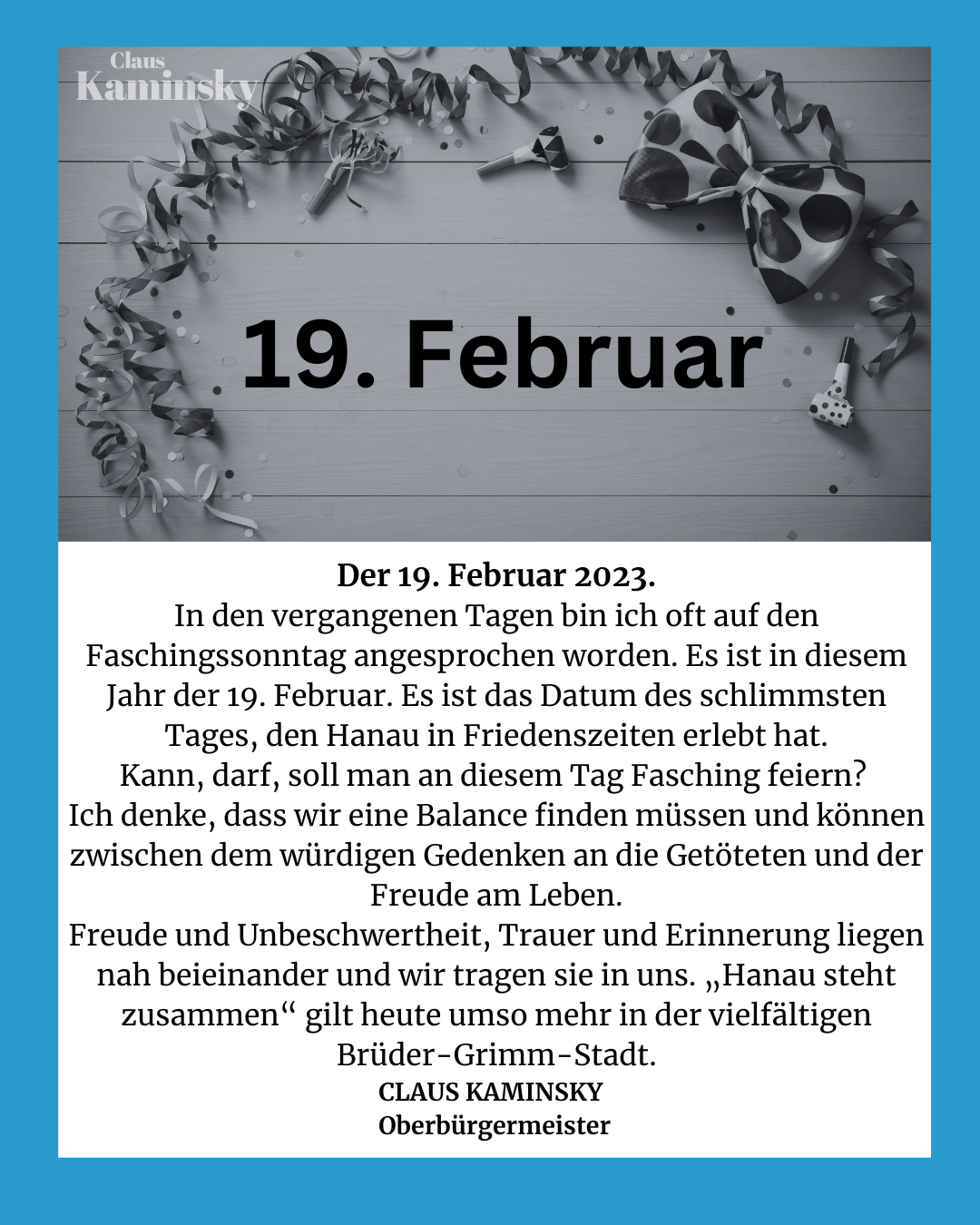 das rassistische Attentat des 19. Februar 2020 hat Hanau nachhaltig geprägt. Das Schicksal der neun Menschen, die dem rassistischen Anschlag zum Opfer gefallen sind, wird auf alle Zeiten im kollektiven Gedächtnis der Stadtgesellschaft verankert bleiben. Wir alle müssen mit der Erinnerung an diesen dunkelsten Tag in der Geschichte Hanaus in Friedenszeiten weiterleben.