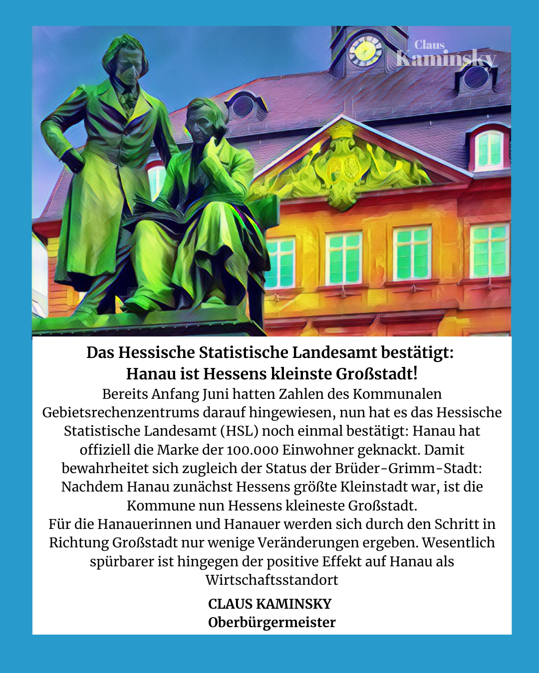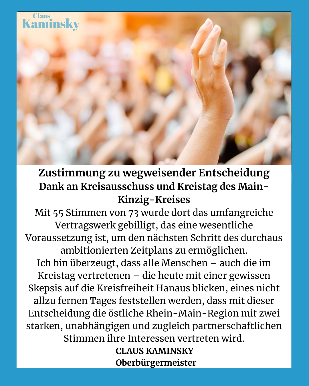 „Der 25. Februar 2025 ist ein historischer Tag für Hanau. Die Bürgerinnen und Bürger dürfen sich durch die Kreisfreiheit auf kürzere Wege, noch effizientere Verwaltungsstrukturen und eine stärkere lokale Entscheidungsfreiheit freuen“, so Oberbürgermeister Claus Kaminsky.