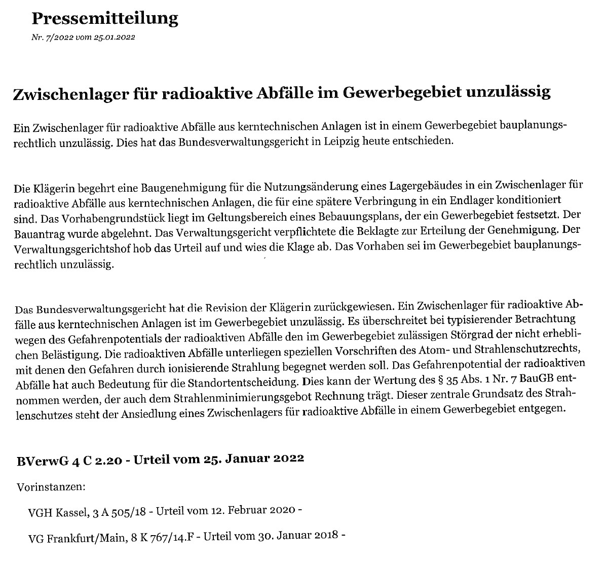 Das Verwaltungsgericht Frankfurt bewertete den Sachverhalt im Februar 2018 anders und hatte ausgeführt, dass es ein Zwischenlager für radioaktive Abfälle trotz der Festsetzungen des Bebauungsplans für zulässig und in einem Gewerbegebiet für verträglich hält.