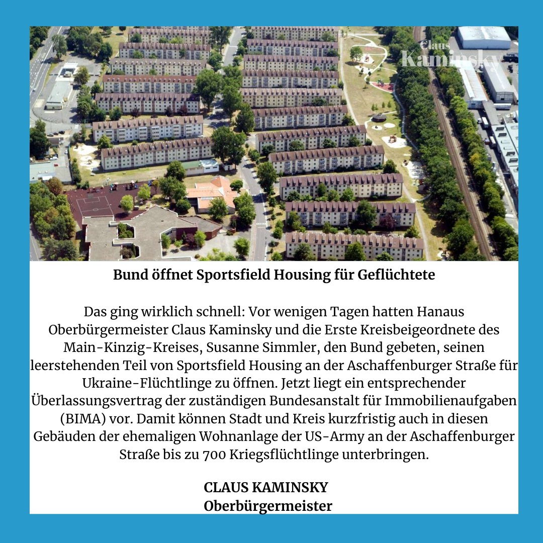 Auf dem Gelände der ehemaligen Sportsfield Housing Area im Hanauer Stadtteil Wolfgang stehen 22 guterhaltene Wohnblocks mit rund 400 Wohneinheiten, die jahrzehntelang als Unterkünfte für US-Soldaten und ihre Familien dienten. In den vergangenen Jahren wurden sie zudem teilweise als Flüchtlingsunterkünfte genutzt. Sie befinden sich aktuell im Besitz der Bundesanstalt für Immobilienaufgaben (BImA).