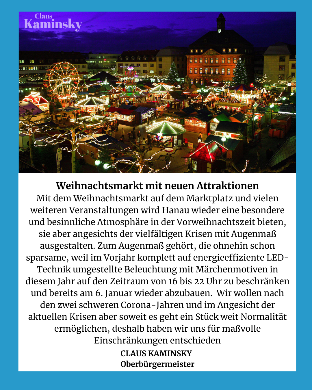 Was für ein Weihnachtsfest, was für ein Jahr! Die Stadt Hanau, unsere Stadt, war und ist doppelt herausgefordert. Neben dem Ausbruch der Pandemie steht das Entsetzen und die Trauer über den Terroranschlag vom 19. Februar. Beides wird uns auch weit über den Jahreswechsel hinaus bewegen.