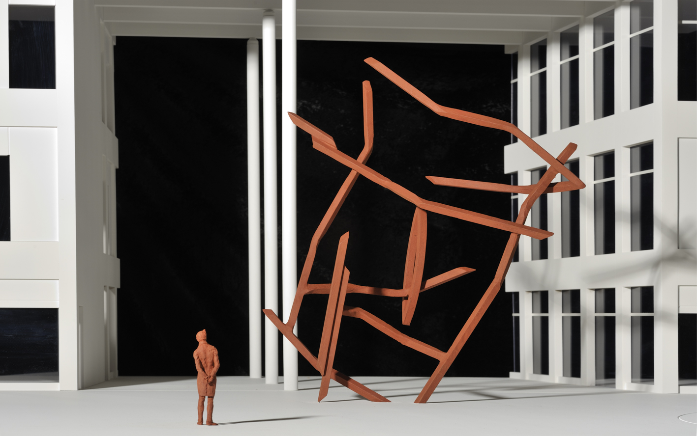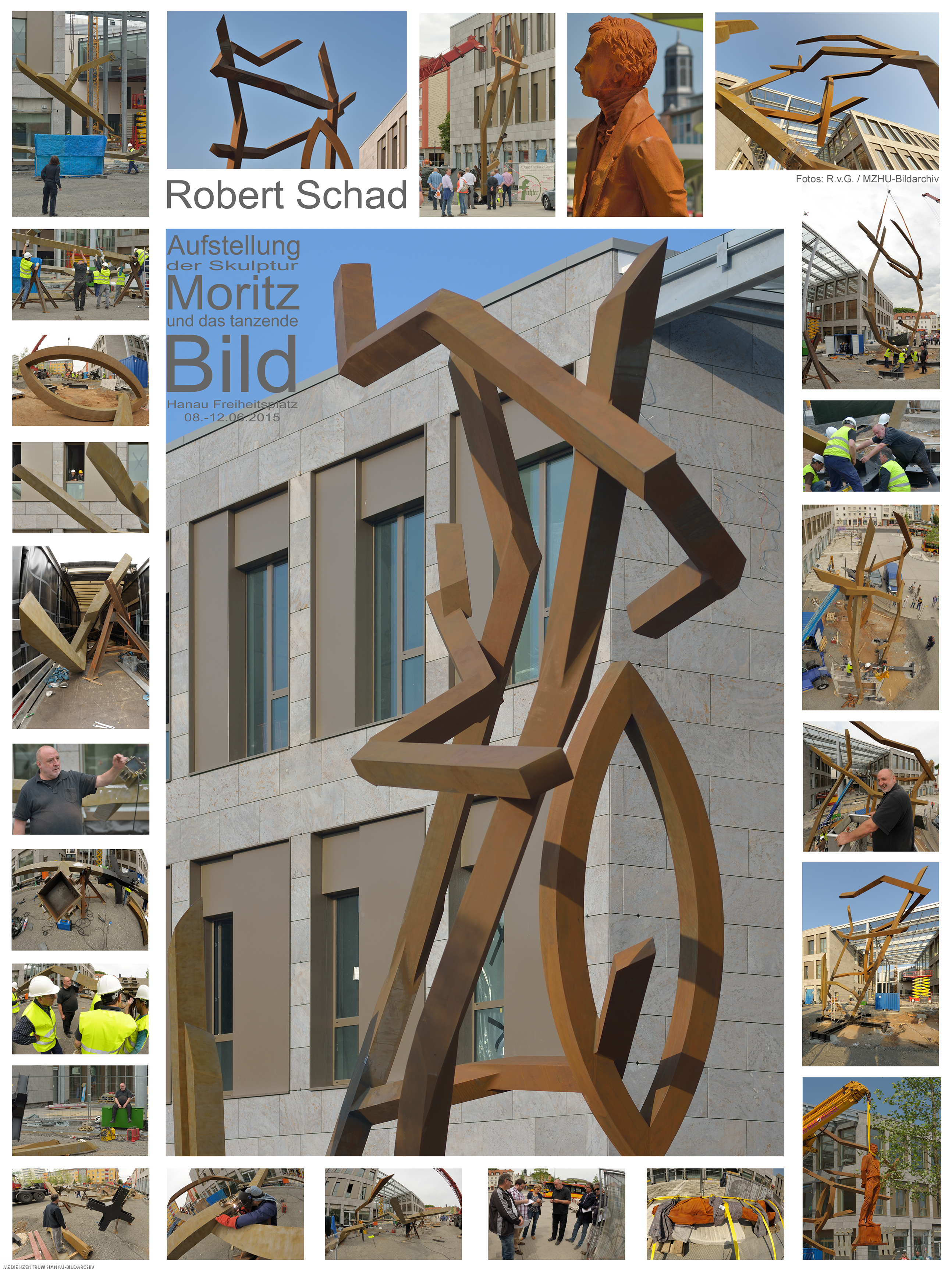 Nichts ist darin, wie er es bisher kennt: Horizonte stürzen, Gegenstände fallen aus dem Bild heraus. Der Künstler nimmt die Erscheinung in Erinnerung mit sich und versucht zu malen, was er sieht. Erst fast 100 Jahre später gelingt es Malern Bilder zu gestalten, die keine Menschen, Gegenstände und Landschaften abbilden. Moritz war der erste, der ein solches Bild sah, ohne es je auf Leinwand gebannt zu haben.“ Das Tanzende Bild ist ein monumentaler, in den Raum gezeichneter Rahmen, mehrfach gebrochen, von diagonalen Horizonten, mit einer Säule und einer ellipsenartigen Form durchzogen. In seiner ausladenden Form und seiner gewagten Statik bildet es einen diametralen Partner zum biedermeierlich gekleideten Moritz und reagiert zugleich auf die strenge Architektur der Stadtloggia. Dass Moritz sich selbstbewusst dem Neuen und Unbekannten stellt, ist Aufforderung an uns, es ihm gleich zu tun. Nur in der selbstbewussten Auseinandersetzung auch mit scheinbar unüberwindlichen Hürden können scheinbar unlösbare Aufgaben gelöst werden und sich die Gesellschaft weiterentwickeln. Dafür ist ein unaufgeregter Blick nach vorne, wie ihn Oppenheim praktiziert, eine Grundvoraussetzung. Der gekippte Rahmen ist transparent, verstellt den Raum nicht und schreibt sich in ihn hinein. Beim Vorbei- und Hindurchgehen vermitteln sich den Betrachtern wechselnde Perspektiven, die dynamisieren. Trotz Tonnenschwere wirkt die Skulptur tänzerisch leicht. Aus der Begründung der Jury: „Robert Schad setzt durch das Denkmal im Dialog zwischen figürlicher und abstrakter Gestaltung ein urbanes und selbstbewusstes Stadtzeichen. In der Gestaltung besteht ein ideales Zusammenspiel von klar gegliederter Gebäudefassade und kraftvoller, aber zugleich verspielter Skulptur. Das Denkmal fügt sich organisch in das architektonische Umfeld ein. Es entsteht ein offener Denk- und Kunstraum. Das Kunstwerk kann sofort erfasst werden und gibt zugleich der Phantasie der Betrachter/innen freien Raum.“