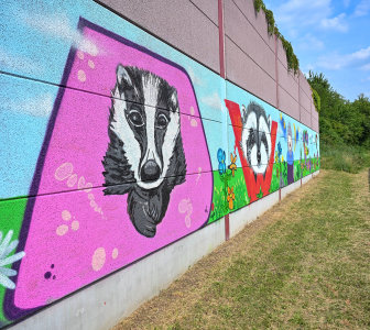 Eine ehemals triste Schallschutzwand entlang der L3309/Ecke „In den Tannen“ erstrahlt seit dem Frühjahr 2025 in neuem Glanz: Zehn Seniorinnen und Senioren der im Familien- und Jugendzentrum Wolfgang (FJW) beheimateten Graffiti-Gruppe „Sprayground“ gestalteten die 125 Quadratmeter große Fläche mit einem farbenfrohen und lebendigen Kunstwerk mit Bezug zum Stadtteil und seiner Natur.